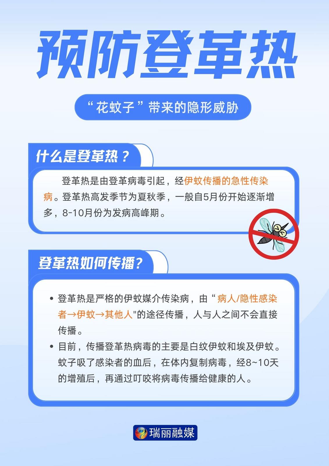 登革热是一种经由伊蚊叮咬传播引起的急性传染病,该种蚊子体表有黑白相间的条纹,俗称‘花蚊子’。登革热与基孔肯雅热临床表现相似,主要症状均为发热、皮疹、关节和肌肉疼痛,但登革热可反复发热,有皮疹、出血及白细胞减少等症状,再次感染时易患重症。