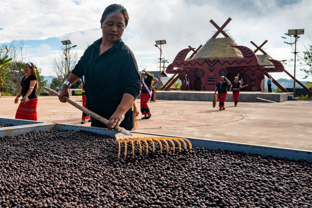 2022年11月16日,云南省普洱市一名农民在晾晒咖啡果。